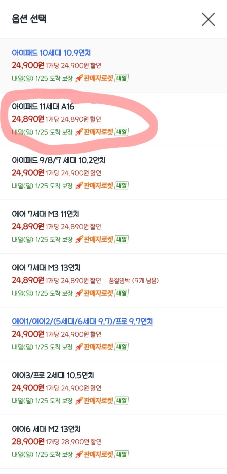 옵션선택에 떡하니 '아이패드 A16모델' 있는데요